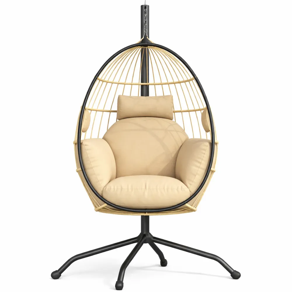 Fauteuil suspendu spacieux au design ouvert, évoquant un nid d'oiseau. Fabriqué avec des cordes tressées, il offre un espace aéré pour se détendre, à l'intérieur ou à l'extérieur. Ce fauteuil œuf de jardin est équipé d'un coussin principal épais et d'un coussin pour la tête, tous deux avec des housses amovibles, adapté pour la lecture ou admirer le coucher de soleil. Chaise pliable facile à ranger lorsqu'elle n'est pas utilisée. Un système de fixation sécurisé limite les mouvements pour un balancement doux. Un porte-gobelet intégré permet de garder votre boisson à portée de main. Cadre en acier thermolaqué sur une base en forme de X avec des pieds antidérapants, supportant jusqu'à 120 kg. La hauteur de la chaîne est ajustable selon vos préférences de balancement. Informations du fauteuil suspendu : Dimensions totales : 120L x 88l x 192H cm ; Dimensions de l'assise : 72l x 56P x 48H cm. Taille du panier plié : 110L x 78l x 19H cm ; Charge max. recommandée : 120 kg ; Assemblage requis.